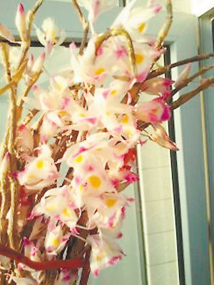 開滿花的鐵皮石斛 本報訊(記者 連聰 文/攝)家中放了半年的“干樹枝”竟然開出花朵,這讓住在通達街附近的鄭先生一家十分驚奇。昨天,記者來到鄭先生家,看到了名為鐵皮石斛的開花“干樹枝”。 記者看到,這簇“干樹枝”約有10多根,每根樹枝都是一截一截的形狀,樹枝呈現(xiàn)出黃褐色,樹枝的中上端開滿白色花朵,每朵花5個花瓣,花瓣的邊沿是淺紫色的,嫩黃色花蕊,聞上去一股清香。鄭先生說,半年前朋友從杭州帶回這些名為鐵皮石斛的“干樹枝”,朋友告訴他這是一種中藥,泡水喝對身體有好處,鄭先生就隨手放到了冰箱上。5月25日,兒媳收拾屋子時以為是父親新買的塑料假花,仔細一看全家才恍然大悟,這干枯的中藥枝子居然開了花。 東北林大植物生態(tài)學教授聶紹荃介紹,鐵皮石斛生長在安徽、浙江等地,是一種中藥植物,花期是4—6個月。鐵皮石斛成為中藥枝后還能開花的現(xiàn)象較少,由于它是熱帶附生植物,所以對濕度要求特別高,如果濕度達到了鐵皮石斛的開花要求,附生植物內(nèi)部本身再殘留水分,無水無土鐵皮石斛也會有開花的可能。 中國石斛網(wǎng)提醒廣大朋友,石斛在自然陰涼狀態(tài)下存放的,是會開花發(fā)芽的,如果吃不完可以用花盆選幾條發(fā)芽好的種起來欣賞。如果是用來食用的石斛,石斛一旦開了花,就會變成“老條”,這樣的石斛是沒有營養(yǎng)價值的。所以,在保存石斛的時候,一旦發(fā)現(xiàn)石斛發(fā)芽、出花苞,就在第一時間把它們都抹掉,只有這樣才能保證石斛的營養(yǎng)不流失。