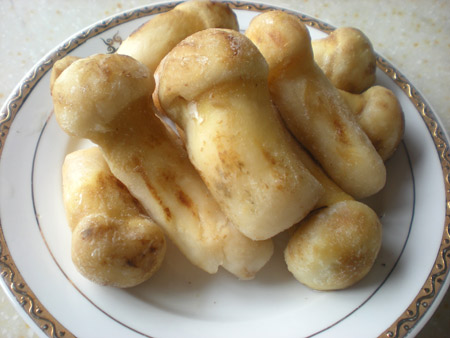松茸燉草雞 2.松茸燉草雞:將洗凈的鮮松茸100g左右和洗凈備用的草雞一起燉制,只放精鹽不放味精至燉熟即可。(也可與排骨、鴿子等一起燉制) 菜肴類: 1.黃油松茸:將洗凈的鮮松茸開片后,放入加熱后的黃油中煎制。待松茸充分飄香后,加入精鹽即可食用。(有條件的也可用烤箱,用錫箔紙包好涂上黃油的松茸烤制) 2.松茸蒸蛋:將雞蛋加少許水打成糊狀后,上籠蒸至六成熟時,將開片松茸加入,繼續(xù)蒸至蛋熟即可。 3.烤松茸:將洗凈瀝干的鮮松茸,放在炭燒板上烤制,烤至香味撲鼻時,夾入已備好醬油和鹽的小碟里即食即用。 4.天婦羅:把切好的松茸1/4條放在由雞蛋、面粉、鹽調(diào)制成的糊中攪拌后用溫油炸至金黃即可。 點心類: