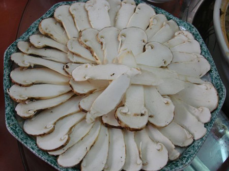 切好的松茸片 燉品類: 1.松茸清湯:將松茸與純水一起燉制15分鐘后,加稍許精鹽,即可食用。清香爽口。每次每人只需20g鮮松茸即可。(也可用高湯燉制,或與蟲草、竹蓀、羊肚菌等一起燉制,但不放味精等其他調(diào)料)