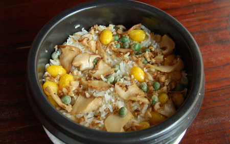 松茸燜飯 1.松茸飯:將大米混合一些糯米淘好后浸水半個小時以上,筍絲、松茸菇、胡蘿卜絲、油炸豆腐片切絲、昆布加醬油和料酒拌勻后放置半個小時,然后混合材料另加醬油、料酒、雞粉,開電飯煲煮,最后的十分鐘時放毛豆,時間到了之后攪拌均勻即可。 2.松茸炒飯:將松茸、雞丁(肉丁)、青豆、胡蘿卜及鹽等一起炒香后盛出。再炒制米飯。之后再一起烹炒即可。 松茸酒: 鮮松茸切片,放入適量白酒中浸泡,數(shù)天后即可飲用?擅刻祜嬘,強(qiáng)身健體。 |