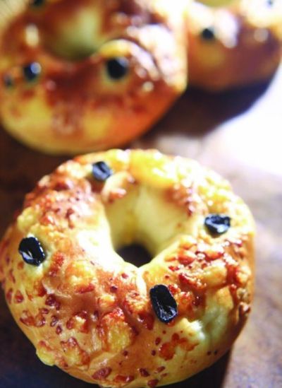 做法:1、將干性材料和濕性材料一起攪拌至面團(tuán)光滑有彈性,加入奶油攪拌至面團(tuán)完成階段;2、室溫30℃基本發(fā)酵40分鐘,分割成150g一個滾圓松弛30分鐘;3、將面團(tuán)桿開放入洋蔥柴魚餡,將面團(tuán)卷成圓柱形,搓成長條形,將面團(tuán)接成圓圈形狀;4、將面團(tuán)沾上芝士絲,將面團(tuán)放入模具,以溫度30℃發(fā)酵50分鐘;5、發(fā)酵好在面團(tuán)表面放上黑橄欖圈,以上火200℃,下火180℃烘烤18分鐘。 柳揚(yáng) 整理 |