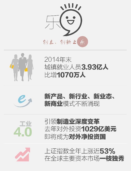喜,即是高興。馬建堂說,2014年,國民經(jīng)濟(jì)在新常態(tài)下保持平穩(wěn)運(yùn)行,呈現(xiàn)出增長平穩(wěn)、結(jié)構(gòu)優(yōu)化、質(zhì)量提升、民生改善的良好態(tài)勢;蛟S,就可以稱其為穩(wěn)中有進(jìn)、進(jìn)中提質(zhì)之“喜”。 數(shù)據(jù)顯示,全年GDP同比增長7.4%,其中第四季度增長7.3%。馬建堂表示,2014年中國克服諸多壓力和挑戰(zhàn),頂住經(jīng)濟(jì)下行的壓力,實(shí)現(xiàn)7.4%的增速,實(shí)現(xiàn)了去年定下的“7.5%左右”的增長目標(biāo)。 匯豐銀行大中華區(qū)首席經(jīng)濟(jì)學(xué)家屈宏斌說,新常態(tài)下中國經(jīng)濟(jì)盡管增長速度有所減緩,但仍然傳出一些令人欣喜的“好消息”:經(jīng)濟(jì)增速下調(diào)同時,產(chǎn)業(yè)結(jié)構(gòu)初見成效,逐漸從對投資、房地產(chǎn)的過度依賴中走出來,新興產(chǎn)業(yè)和新興服務(wù)業(yè)發(fā)展態(tài)勢良好。 屈宏斌指出,第三產(chǎn)業(yè)在吸引就業(yè)方面存在一定的優(yōu)勢,這種產(chǎn)業(yè)結(jié)構(gòu)的調(diào)整帶來就業(yè)的穩(wěn)定,為中國經(jīng)濟(jì)體制改革提供了有力的保障。 新常態(tài)下,中國經(jīng)濟(jì)結(jié)構(gòu)不斷優(yōu)化升級,第三產(chǎn)業(yè)、消費(fèi)需求逐步發(fā)揮主導(dǎo)作用。2014年中國第三產(chǎn)業(yè)增加值占GDP的比重為48.2%,比上年提高1.3個百分點(diǎn),高于第二產(chǎn)業(yè)5.6個百分點(diǎn)。需求結(jié)構(gòu)繼續(xù)改善,全年最終消費(fèi)支出對GDP增長的貢獻(xiàn)率為51.2%,比上年提高3個百分點(diǎn)。 初步核算,去年中國GDP為63.6萬億元,若按去年末人民幣兌美元匯率中間價計算,約為10.4萬億美元,超越10萬億美元大關(guān)。中國繼美國之后成為第二個“10萬億美元俱樂部”成員,穩(wěn)居世界第二,約是日本的兩倍。 國泰君安首席經(jīng)濟(jì)學(xué)家林采宜說,GDP突破10萬億美元早在市場預(yù)期當(dāng)中,更值得關(guān)注的是人均GDP,約為7400美元,全球排名80位左右。 林采宜說,這意味著中國還處在中等收入國家水平,還需保持較高增速才能邁過所謂“中等收入陷阱”,那就更需要通過轉(zhuǎn)型創(chuàng)新和全面深化改革來激發(fā)市場活力,實(shí)現(xiàn)持續(xù)增長。 表情二:創(chuàng)業(yè)創(chuàng)新之“樂”