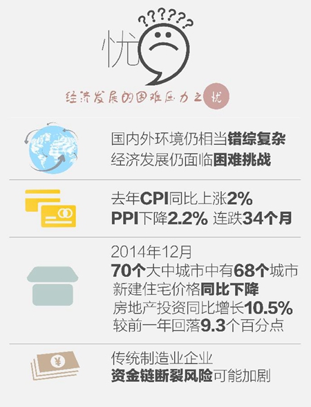 憂,即擔(dān)憂、隱憂。2014年,中國經(jīng)濟(jì)遭遇諸多挑戰(zhàn)和困難,包括樓市低迷、地方債務(wù)高企、工業(yè)產(chǎn)能過剩等,可謂經(jīng)濟(jì)發(fā)展的困難壓力之“憂”。 馬建堂坦言,2014年“很不容易”,碰到了很多挑戰(zhàn),遇到不少困難。要清醒認(rèn)識到,國內(nèi)外環(huán)境仍然相當(dāng)錯綜復(fù)雜,經(jīng)濟(jì)發(fā)展仍面臨不少困難和挑戰(zhàn)。 屈宏斌認(rèn)為,CPI、PPI等價格指標(biāo)持續(xù)下行,實(shí)際上反映了內(nèi)需的低迷,通縮風(fēng)險將再次考驗(yàn)中國經(jīng)濟(jì)承受力。“去年下半年以來,國際大宗商品特別是原油價格大幅下挫,其對下游各個產(chǎn)業(yè)的傳導(dǎo)效應(yīng)或許才剛剛開始,這將進(jìn)一步加劇通縮的可能!彼嵝颜f。 數(shù)據(jù)顯示,去年中國居民消費(fèi)價格(CPI)同比上漲2%,工業(yè)生產(chǎn)者購進(jìn)價格(PPI)下降2.2%。去年底,CPI持續(xù)下行進(jìn)入“1”時代,PPI則連續(xù)34個月下跌。 房地產(chǎn)市場同樣處于低谷。數(shù)據(jù)顯示,2014年12月,除廈門和鄭州外,70個大中城市當(dāng)中有68個城市的新建住宅價格均同比下降。全年房地產(chǎn)投資同比增長10.5%,增幅明顯回落。去年全年,房地產(chǎn)投資同比增長10.5%,較前一年大幅回落9.3個百分點(diǎn)。 屈宏斌說,在取消“限購”和房貸放松等措施刺激下,房地產(chǎn)市場已經(jīng)趨于穩(wěn)定,但在2015年中期之前還難見起色。 林采宜認(rèn)為,在調(diào)整經(jīng)濟(jì)結(jié)構(gòu)、淘汰過剩產(chǎn)能過程中,傳統(tǒng)制造業(yè)企業(yè)出現(xiàn)資金鏈斷裂的風(fēng)險可能加劇,這將導(dǎo)致信用違約風(fēng)險的進(jìn)一步發(fā)酵,商業(yè)銀行的壞賬率還有進(jìn)一步提升的可能。 國際貨幣基金組織(IMF)20日把中國2015年的經(jīng)濟(jì)增速預(yù)測下調(diào)0.3個百分點(diǎn),至6.8%。 李克強(qiáng)總理19日在國務(wù)院全體會議上表示,2014年,我國發(fā)展面臨的國內(nèi)國際環(huán)境復(fù)雜嚴(yán)峻,經(jīng)濟(jì)下行壓力持續(xù)加大,多重困難和挑戰(zhàn)相互交織。2015年經(jīng)濟(jì)下行壓力依然較大,面臨的困難可能更多,政府工作艱巨繁重。 表情四:穩(wěn)中求進(jìn)之“盼”