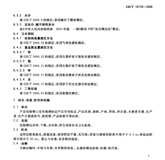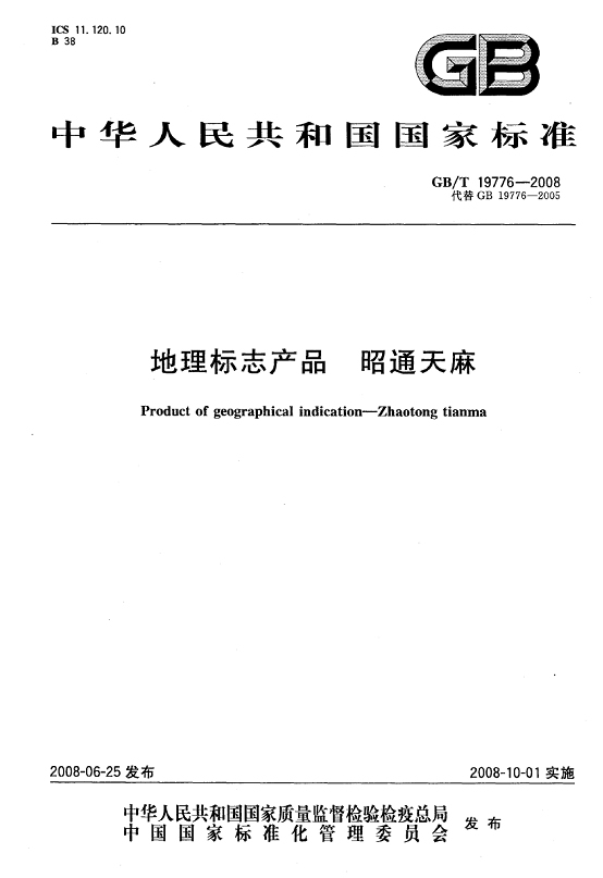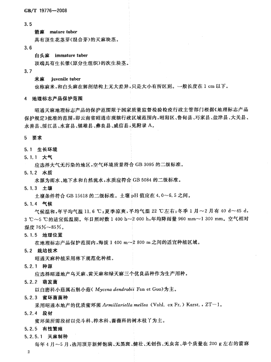 天麻交收品質(zhì)要求:外觀呈寬卵形、卵形、橢圓形,略扁,稍彎曲;長(zhǎng)6 cm~12 cm,寬2cm~6 cm,厚1 cm~4 cm;數(shù)量/ (個(gè)/kg)≤46,單個(gè)重量/(g/個(gè))≥22;感官指標(biāo)、理化指標(biāo)、衛(wèi)生指標(biāo)、檢驗(yàn)方法、包裝和貯存要求等按照《中華人民共和國(guó)國(guó)家標(biāo)準(zhǔn) 地理標(biāo)志產(chǎn)品 昭通天麻》[GB/T 19776-2008](附件一)執(zhí)行。 附件一: